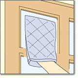 市販のガラスクリーナーをやわらかい布にスプレーし、その布で汚れをこすり落とします(クリーナーをガラスに直接スプレーすると、周囲の木部に飛び散りシミをつくる恐れがある)。
