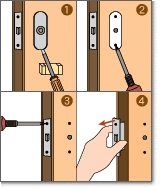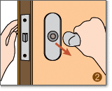 トイレなど頻繁に開閉するドアは、年月の経過によりハンドルが下がったまま上がらなくなることがあります。これは本体内部のバネの破損が原因ですので、本体ごと交換しましょう。レバーとバネや台座がセットになったものを取り寄せ、左図の要領で交換してください。 |