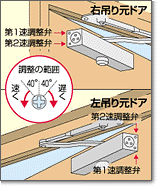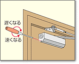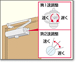 右吊り元ドア(屋外から見て蝶番が右側にあるドア)は第1速が上の調整弁、第2速が下の調整弁、左吊り元ドアは上下が逆になり、上が第2速、下が第1速の調整弁です。どちらもプラスのドライバーで調整します。 |