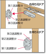 右吊り元ドア(屋外から見て蝶番が右側にあるドア)は第1速が上の調整弁、第2速が右下の調整弁、第3速が左下の調整弁です。左吊り元ドアは上下(第1速と第2速)が逆になり、第3速が右上の調整弁になります。 |
