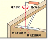 ドアのつけ根に近いほうが第1速、遠いほうが第2速の調整弁です。マイナスドライバーで調整します。 |