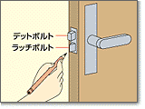 ラッチボルトの閉まりが悪くてドアがきちんと閉まらないときは、ラッチボルトに潤滑剤を差すとスムーズに納まります。潤滑剤の代わりに、ラッチボルトの根元に鉛筆の芯をこすりつける方法もあります。