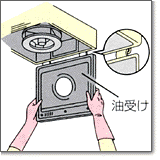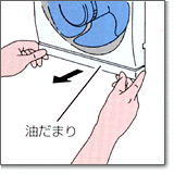 後部の蝶番を軸に扇状に開き、そのまま手前に 引いて油受けをはずします |