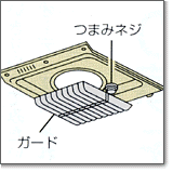 油受けについているガードも、両側のつまみネジを ゆるめてはずします |