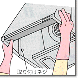 ステンレスのグリスフィルターをはずした後、前板取り付けネジをゆるめ、前板を手前に引いてはずします |
