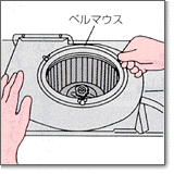 シロッコファンのベルマウス取りつけネジ3ヵ所を 手ではずし、ベルマウスをはずします |
