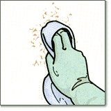 布のほうにスプレーし、ポンポンと たたくようにして落とす |