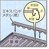 ファミエスによる折板屋根施工例 エキスパンドメタル(網目が菱形になった網)を屋根の形状に合わせてカットし、ピッタリ取りつける |