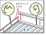 鳥の侵入を防ぐには、屋根のすき間をふさぐように、網目がひし形のエキスパンドメタルの網を張って、鳥が侵入できないようにします。セキスイファミエスでは図のような方法で、屋根に網を張っています。ピッタリ張るには技術がいる上、高所での作業となるので危険を伴います。セキスイファミエスにご相談ください。