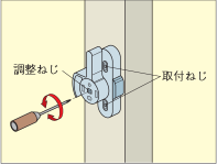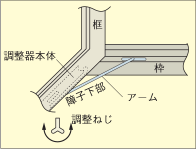 サッシの開閉力は、調整ネジの締め加減で調整します。右に回すと開閉力は重くなり、左に回すと軽くなります。強風であおられない程度のかたさに調整して使用してください。 |