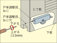 障子と枠の間にすき間やガタツキがあるときは、ドライバーで障子の下部の戸車調整用ネジを調整して、上下と傾きの調節をしてください。 |