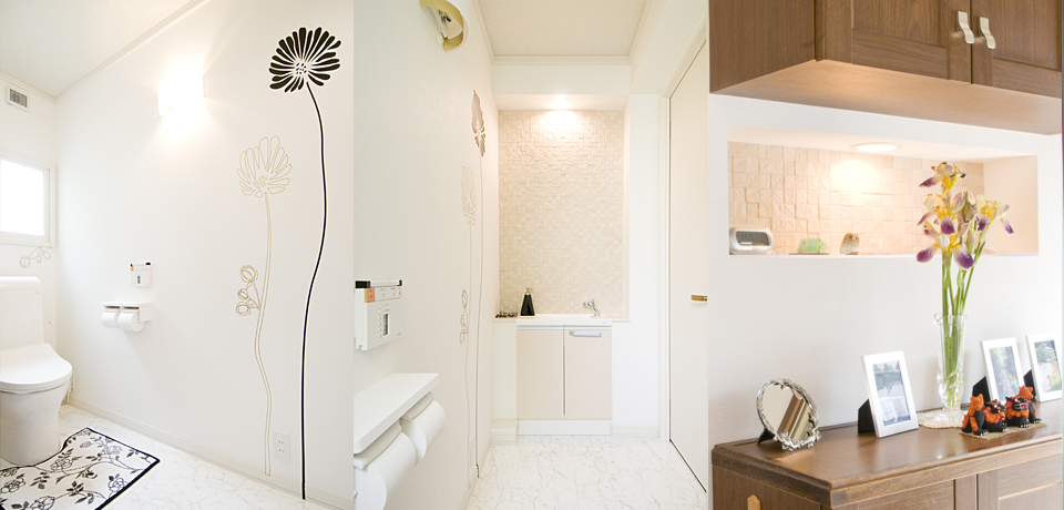 明るくゆったりしたトイレ空間は、白い壁に貼られた花のステッカー“ウォールデザイン”(仏製)と、手洗い上のエコカラットがポイントです。