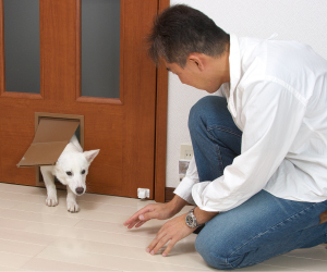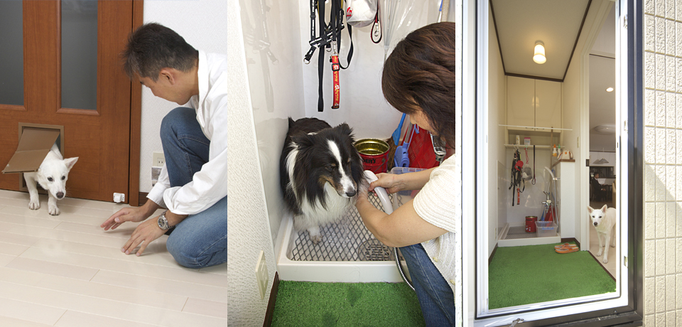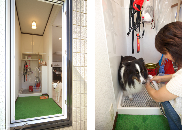 愛犬たちのお散歩後の足洗いに、庭から入れるシャワーブースが大活躍。キレイになったら、リビングへ直行。また、玄関ホールとリビング間のドアはペットドア付きで、愛犬たちは自由に出入りできます。