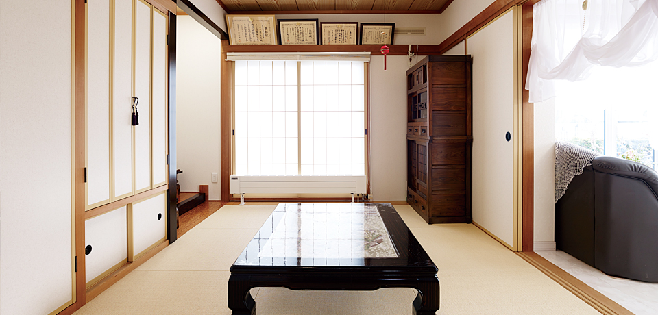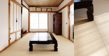 リビングに隣接するモダンな和室。床には畳縁のない琉球畳を採用。