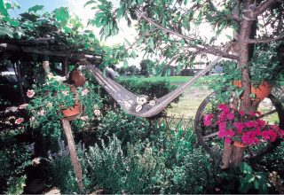 暖かい季節になるとS様邸の庭は緑が溢れる空間となる。木製の車輪やハンモックなど遊び心いっぱいの演出が道行く人を楽しませている。