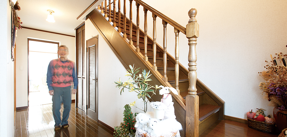 廊下は既存の木製階段手摺の質感色調に合わせた床材で張替え。重厚感ある玄関ホールに仕上がる。