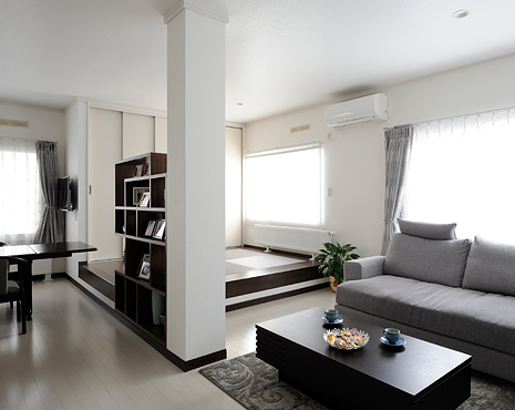 畳スペースの小上がりもある、明るいLDK。「床は茶色にしようと思っていましたが、白も明るくて良いものですね」(ご主人様)