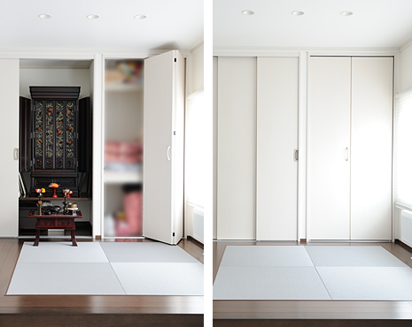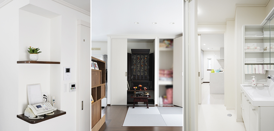 一見壁と見間違えそうな白い扉を開けると、右手には布団収納、左手にはお仏壇が。「お仏壇の扉は、使い勝手が良いようにと3枚引き戸にしてくださいました」(奥様)