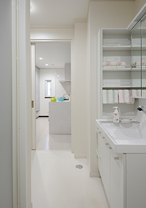 洗面脱衣室の引き戸を開ければ、すぐキッチン。「家事はもちろん、将来の介護も見すえ、キッチンからサニタリー、寝室、廊下と回遊できる生活動線にしてもらいました」(奥様)