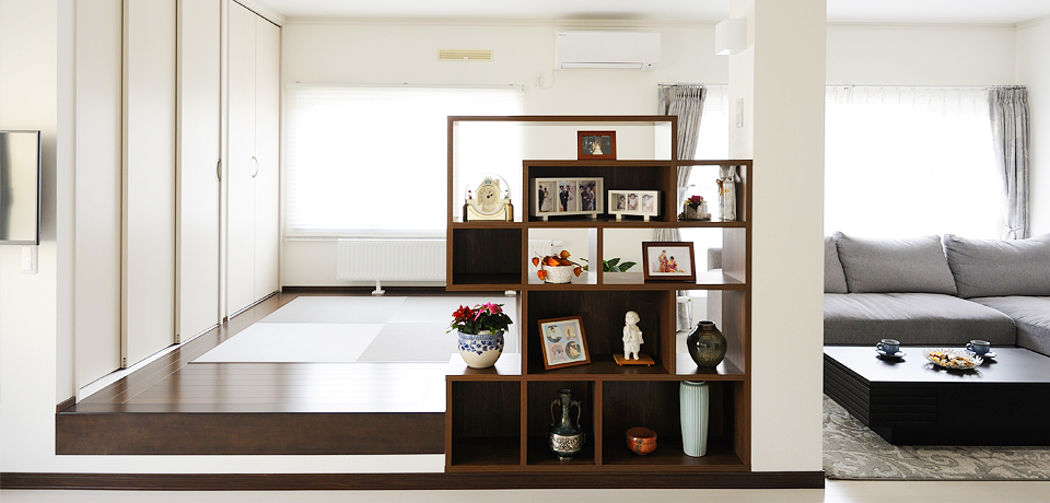 奥様が家具店で見つけられたという飾り棚を、小上がり横のユニット柱に合体。柱も目立たず、素敵なコーナーになりました。「孫たちの写真を置き替えては、楽しんでいます」(ご主人様)
